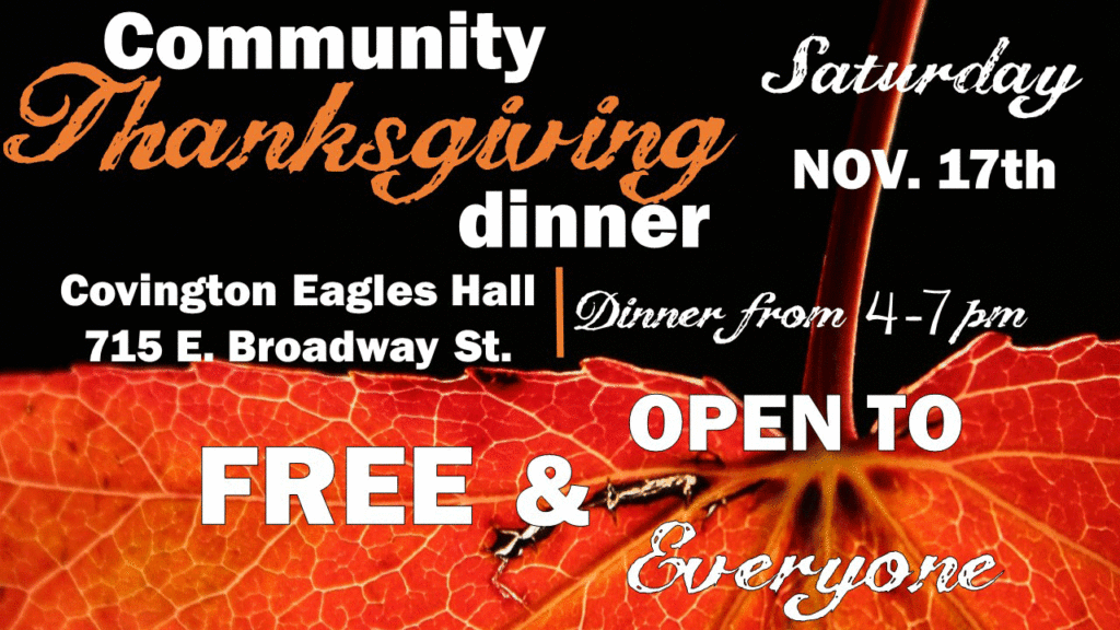 FREE COMMUNITY THANKSGIVING DINNER The Covington Eagles and Fields of Grace Worship Center will host a FREE Thanksgiving dinner on Saturday November 17 from 4:00 -7:00 p.m. at the Covington Eagles Hall. Those attending are asked to please enter through the Debra Street entrance to the hall. The meal this year will consist of turkey, mashed potatoes, gravy, homemade dressing, homemade noodles, … [Read more...]